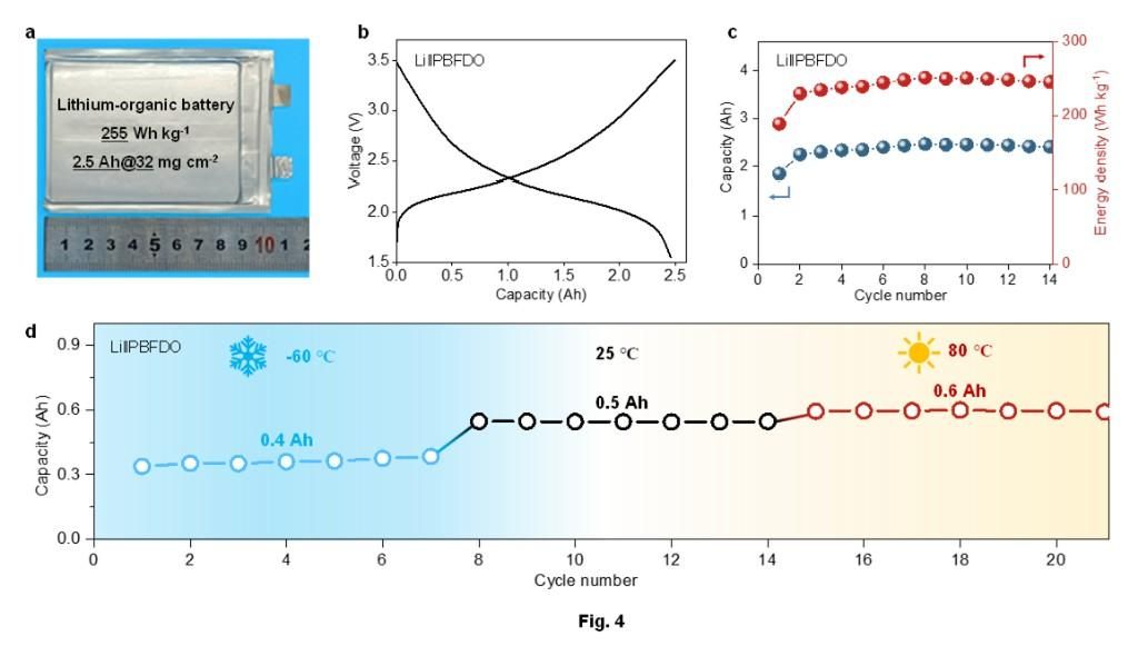 为解决这一困境,该研究团队在新型n型导电聚合物材料聚(苯并二呋喃二酮)(PBFDO)基础上,系统调控了材料中电子与锂离子的“协同传输”效率,成功研制出一种兼具优异电子导电性、锂离子快速传输能力和高储能容量的有机正极材料。基于此材料,团队制备出一款能量密度超过250瓦时/公斤的有机软包电池。这一数值已超越目前广泛使用的磷酸铁锂电池,且该电池展现出卓越的温度适应能力,不仅能在-70℃到80℃的极端温度下正常工作,还兼具良好的柔韧性与安全性。实验表明,其电极在弯折、拉伸甚至外力挤压后仍保持完好,且电池容量不减。团队研制的安时(Ah)级别软包电池成功通过了严格的针刺安全测试,在充放电过程中不变形,安全性得到验证,标志着有机电池从实验室走向实际应用迈出了关键一步。