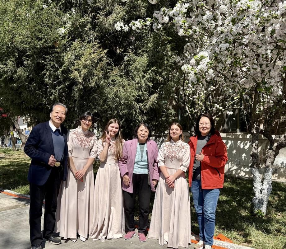 游客与前来赏花并参加春日演出活动的乌克兰留学生合影留念 摄影 王寒阳