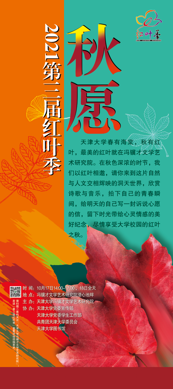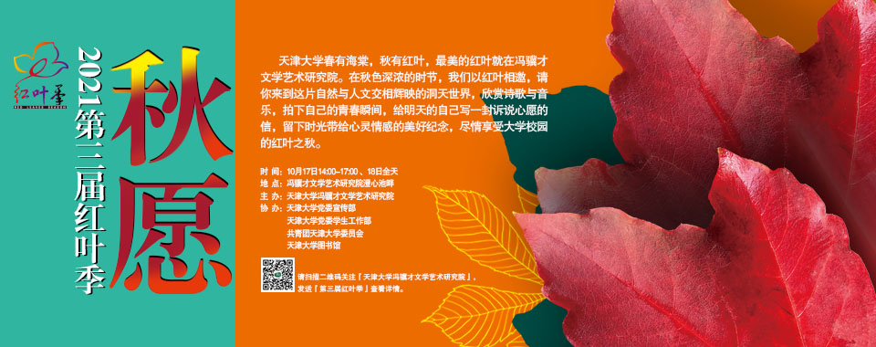 秋愿·2021第三届红叶季由冯骥才文学艺术研究院主办,天津大学党委宣传部、党委学生工作部、共青团委、图书馆共同协办。(因疫情防控要求,仅限校内师生参加)