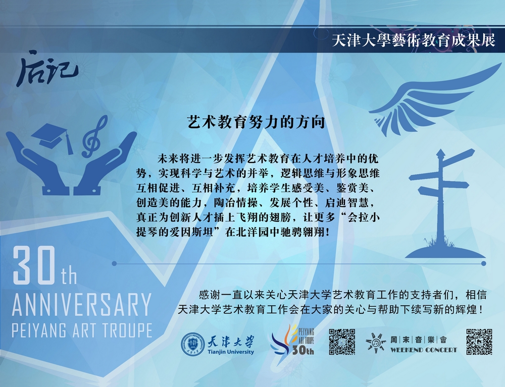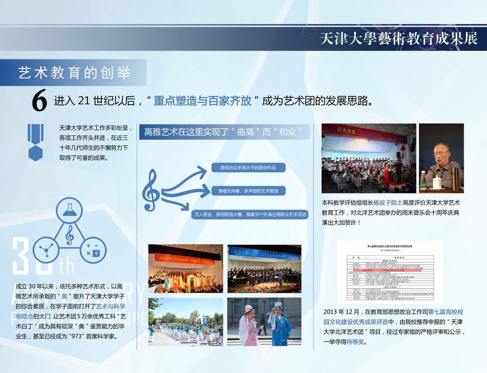天津大学在多年的文化艺术教育实践中,坚持将“培养会拉小提琴的爱因斯坦、培养可以借助艺术的翅膀使科学思维飞翔的大师”作为艺术育人的理念,多途径、多方法地推进文化素质教育。