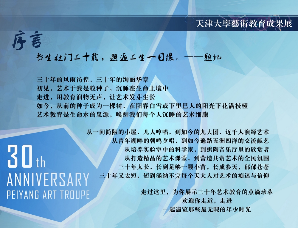 本站讯(记者 朱宝琳)日前,“三十载笙箫岁月 书不尽艺术华章——天津大学艺术教育成果展”在卫津路校区九楼西侧橱窗、北洋园校区杏荪楼前橱窗中展出。展览集中展示了我校以高雅艺术为特色的多彩校园文化。