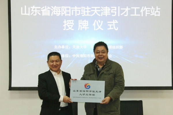 翟京生、孙晓波共同签署了《关于合作建立海阳市驻天津引才工作站的协议》,孙晓波向海洋学院授牌,成立了山东省海阳市驻天津人才工作站牌。