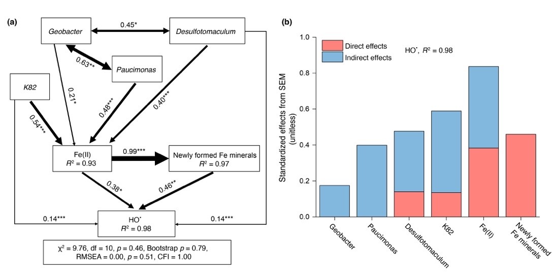 天津大学地科院余光辉教授利用长期定位施肥土壤富集微生物群落,探究了微生物群落-铁矿物协同驱动土壤泥浆中羟基自由基形成的途径和机制。研究发现,微生物和铁矿物协同驱动了土壤泥浆中羟基自由基的形成;培养21天后,培养体系中羟基自由基浓度可达100nM。借助化学分析、同步辐射、高通量测序、随机森林和结构方程模型等分析手段和统计方法,研究发现微生物可通过调控超氧离子直接影响羟基自由基形成,也可通过驱动铁矿物转化而间接调控羟基自由基产生。其中,微生物驱动的铁矿物氧化还原转化是土壤泥浆中羟基自由基形成的主控因子;Geobacter,Paucimonas,Rhodocyclaceae_K82和Desulfotomaculum是土壤中控制羟基自由基产生的关键微生物属。该发现对全面认识表层地球系统中活性氧的形成途径具有重要意义,也可为深入理解氧化还原波动环境中碳周转和养分循环提供新认识。