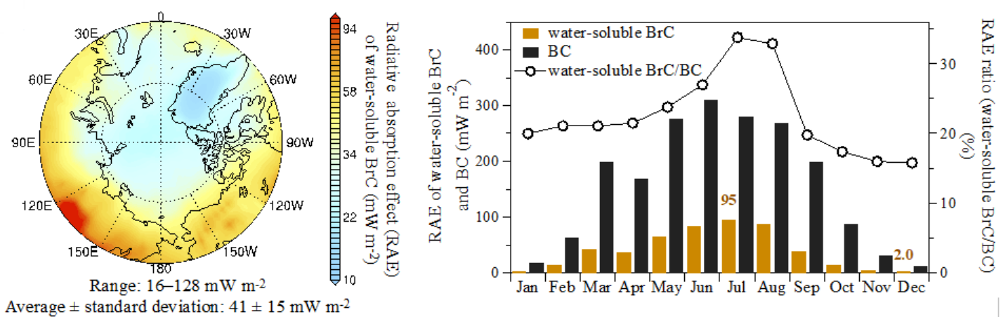 北极地区正以全球其他地区两倍的速度快速变暖,引起了全世界的高度关注。北极的冰川融化、海冰减少,和随之引发的全球大气环流异常,地区生物多样性减少,以及一系列生态和经济问题都源于北极气候的快速变暖。众所周知,二氧化碳气体和黑碳气溶胶是大气中最重要的增暖剂。然而,近年来,科学家们逐渐关注到另一类辐射吸收性有机气溶胶——棕碳对气候变暖有不可忽视的贡献。那么棕碳气溶胶的增暖效应对北极的气候变化有多大贡献?北极的棕碳来源又是什么? |