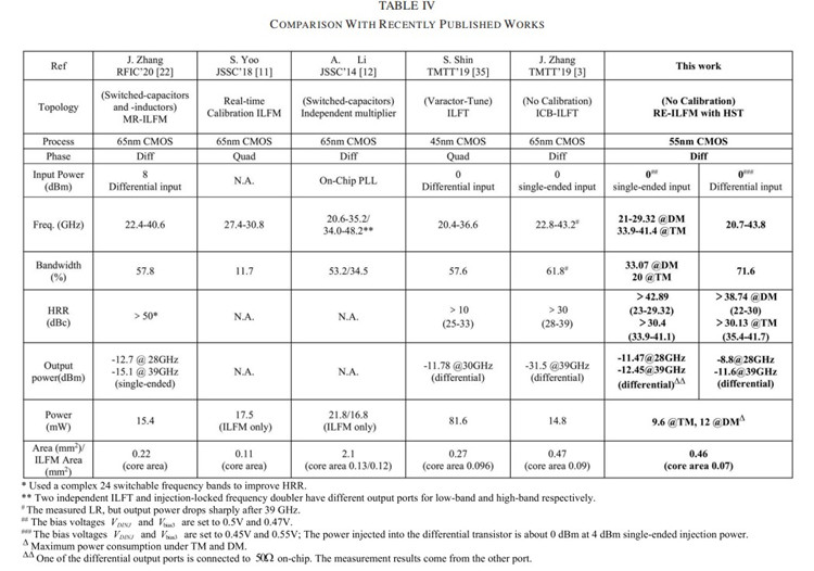 随着新一代通讯技术5G毫米波/6G的演进发展,工作于毫米波频段的无线射频系统具有越来越多的吸引力。作为射频系统中的关键电路,毫米波频率源面临宽带、低功耗以及低相位噪声三方面挑战。本项工作基于电磁调控理论提出应用于5G通信的多核频率可重构注入锁定倍频器, 利用马凯学教授国际上提出的多谐振荡器腔(multi-tanks)技术将二倍频和三倍频在同一款芯片融合实现,在兼顾小型化与高效率的同时,实现了5G毫米波所需的20.7 GHz~43.8 GHz 的全频带覆盖。该款芯片是国际上首款2倍/三倍频率可重构注入锁定倍频器芯片, 在相同注入功率情况下,锁定带宽、输出功率、面积以及谐波抑制指标均处于国际领先,为5G毫米波多频段、多标准融合通信系统的实现提供了技术支撑。