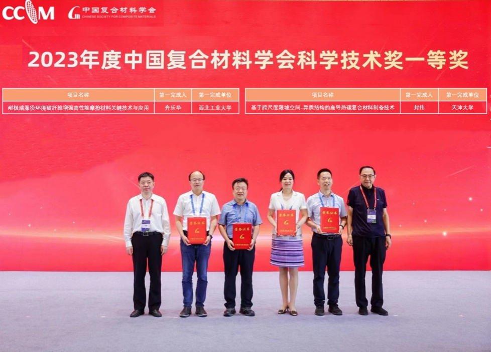 本站讯(材料学院供稿)2024年7月27日,2023年中国复合材料学会科学技术奖颁奖典礼在新疆乌鲁木齐国际会展中心举行。中国复合材料学会荣誉理事长、中国工程院院士杜善义教授和中国复合材料学会第八届理事会理事长、中国工程院院士、东华大学校长俞建勇教授共同为获得2023年度中国复合材料学会科学技术一等奖获奖者颁奖(全国共计两项)。其中,天津大学封伟教授因在导热复合材料方面的显著成就,以第一单位完成人身份荣获2023年度中国复合材料学会科学技术一等奖,项目名称为“基于跨尺度限域空间-异质结构的高导热碳复合材料制备技术”。