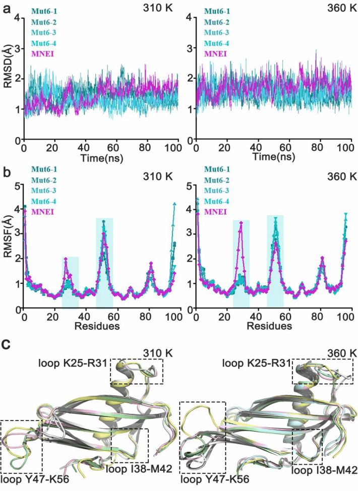 进一步通过分子动力学模拟结合结构分析的手段发现突变体结构中一些柔性环区域的稳定性显著增强(如loop K25-R31和loop I38-M42),这些柔性还区域增强的协同效应使得整体结构稳定性的增强。