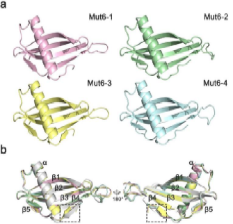 本研究采用坐滴法进行蛋白结晶,通过系统优化沉淀剂浓度、pH值及温度等结晶条件,成功获得四个突变体的高分辨率结构模型(分辨率分别为1.50 Å,1.43 Å,1.90 Å 和1.50 Å),结构比对分析显示,所有突变体与MNEI有相似的折叠模式,且均方根偏差(RMSD)均小于0.5 Å,表明突变并未引起整体结构的显著改变。
