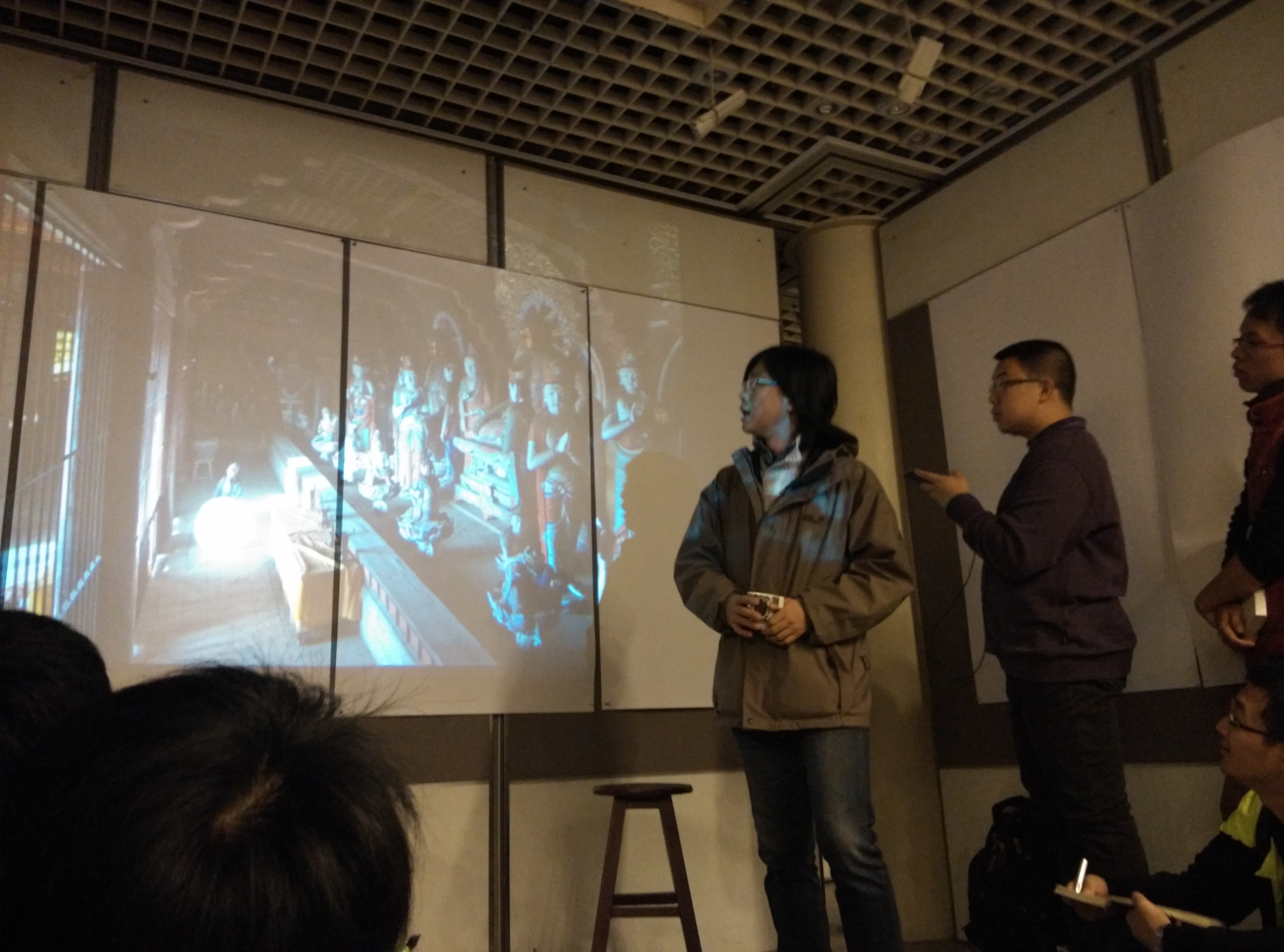 佛光寺又名佛光寺东大殿,坐东朝西,大殿中部散布大小佛像30余尊,大殿西侧和后部还有塑像近300尊。把这座古刹“搬”到课堂上,还得让学生身临其中,丁垚花了一番心思:“我们的建筑系馆和佛光寺的几何和空间关系非常相似:建筑系馆也为东西向方位,与佛光寺方位吻合;建筑系馆内一层通往二层的登楼楼梯则可以模拟佛光寺大殿外拾级而上的台阶。”于是,丁垚按照1:4的比例把佛光寺“微缩”到了建筑系馆。他在建筑系馆二层的三侧墙壁上布置18块高度相同的白色展板来模拟佛光寺墙壁;利用两台高度相同的立式投影仪将佛光寺殿内300余尊塑像图片按照真实方位平行放映在对应的展板上;通过控制馆内的4排灯光来调节明暗和光影。更妙的是,他还利用一台便携式投影仪进行移动放映,引导学生们在虚拟佛光寺中参观、走动,学生可以由“台阶”走进“殿内”,由“殿内”看到“殿顶”,实现了“全息投影”的效果。