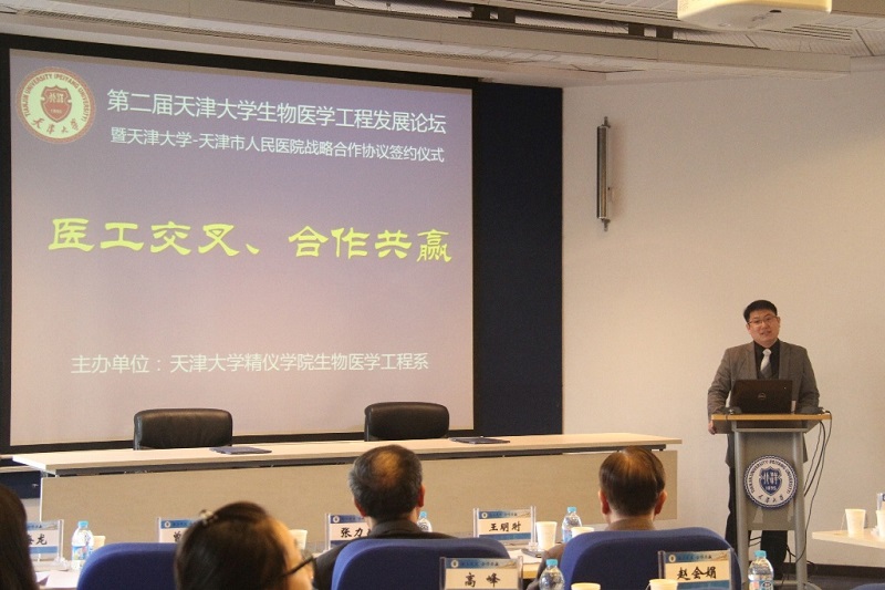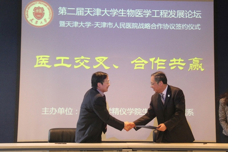 我校生物医学工程系主任、研究生院学科建设办公室主任明东教授致开幕辞。他首先对人民医院及相关企事业单位负责人的到来表示欢迎,并进一步指出生物医学工程专业作为以工为主、医工结合的综合性交叉学科,一直注重培养学生的创新思维和实践能力,力争将医学问题转变为课题资源优势;通过临床医生和理工科研究人员结对的方式,将学科互补化为人力资源优势;将学校理工优势与天津市人民医院的临床医学经验充分结合,着力营造临床需求驱动的多学科交叉研究环境。接下来,我校生物医学工程学科创始人、在学术界颇负盛名的王明时教授发表了讲话,老先生着重强调了将工程科学应用于临床医学,是造福社会的好事。王先生希望专业能够与天津市人民医院及相关将在科学研究、人才培养、科技成果转化等方面开展全面合作。之后,我校校长助理张力新研究员、天津市人民医院院长朱思伟教授分别发表讲话,以发展视角,从战略高度表达了医工结合的迫切需要,认为这样的合作既是天津大学创新学科发展思路的开拓之举,也是带动天津市医疗技术发展及相关学科提升的重要力量。讲话过后,张力新研究员、朱思伟教授分别代表天津大学、人民医院签订了战略合作协议,并由张力新研究员向朱思伟教授颁发了天津大学生物医学工程专业兼职教授的聘书。