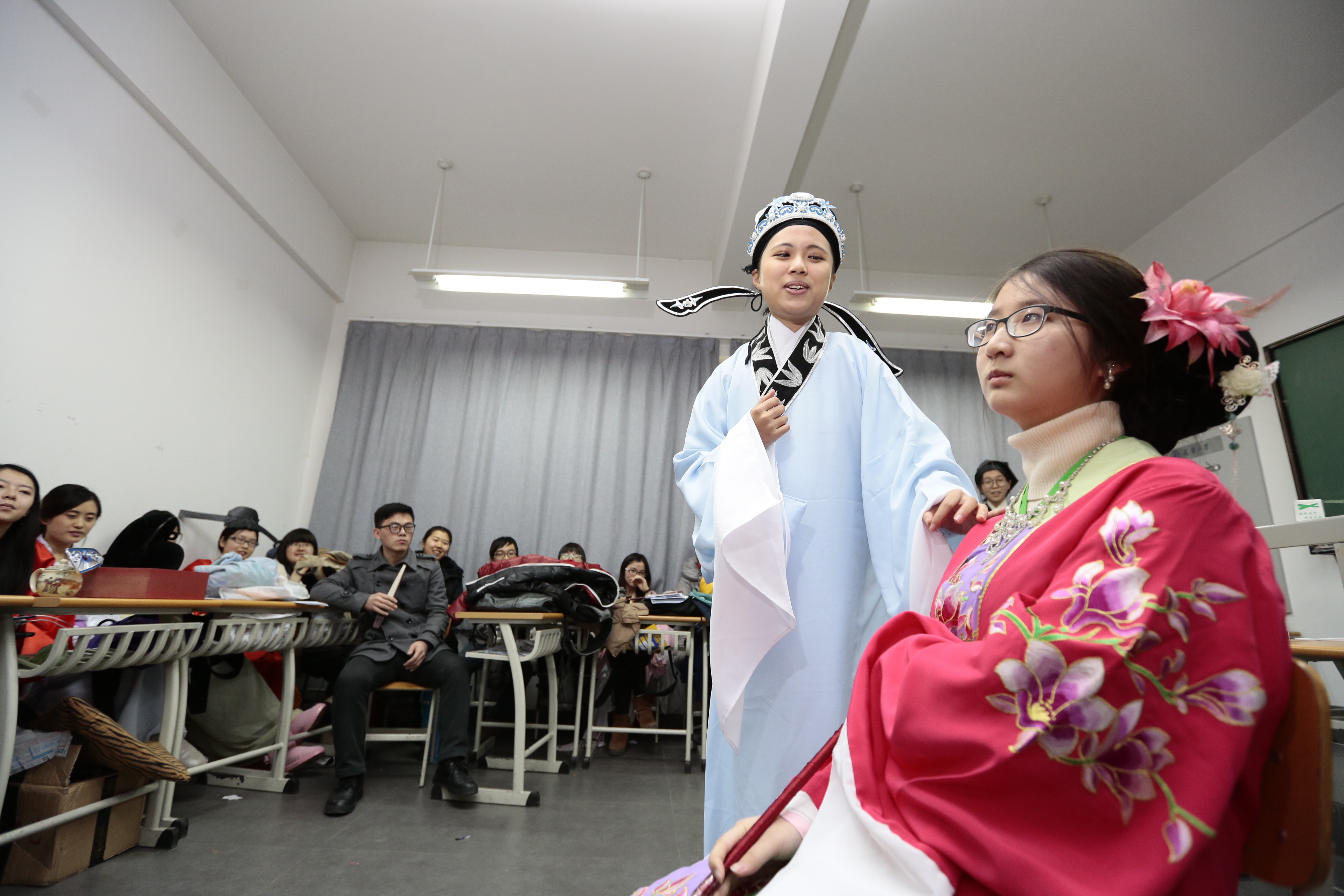 1月8日下午,在天津大学26教学楼的一间教室里,一场“年度大戏”正在上演。《兰亭白雪》、《观中奇缘》、《狮吼记·跪池》……一出出由大学生们自编自导自演的舞台剧在小小的教室里轮番上演。