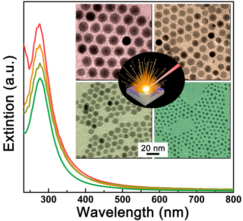 单分散纳米晶是指尺寸、形貌高度一致的纳米颗粒。单分散非贵金属纳米颗粒具有广泛应用。传统化学制备方法需要引入毒性强、复杂、昂贵的有机金属前驱体或/和强还原剂,且往往不易获得,导致合成非贵金属纳米晶体系受限。杨静研究员指导硕士生罗瑞春基于金属纳米晶对近红外光吸收较弱的特点,采用低能量密度近红外脉冲激光烧蚀/辐照非贵金属靶材的方法,简便地实现了粒径可调、单分散非金属胶体纳米晶的可控合成,并结合粒径动态分析及理论计算,阐明了“激光选择性逐层表面气化”调控粒径机制。研究发现,新型的单分散镉纳米晶在深紫外区具有强烈局域表面等离激元共振特性,有望应用于超高灵敏度分子检测。该方法普适性强,为新型功能性单分散非贵金属胶体纳米晶的可控合成开辟了一条新途径。此项研究得到了国家自然科学基金(51271129)的支持。