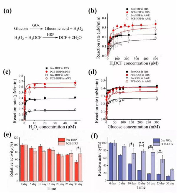 图2. 两性离子水凝胶固定化酶(PCB-GOx,PCB-HRP)在PBS环境和模拟伤口分泌液环境(AWE)中的催化活性测试