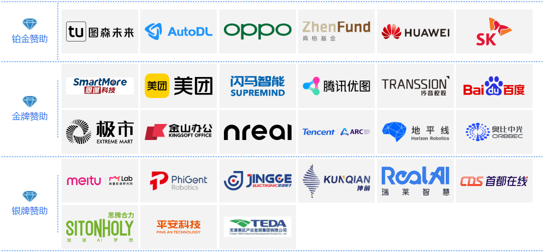 VALSE汇聚了全国乃至海外的优秀学者共聚一堂,也吸引了相关领域诸多一线企业慷慨赞助。本届会议共得到27家企业的赞助,其中包括6家铂金赞助商、12家金牌赞助商和9家银牌赞助商。上述企业不仅给予大会经费支持,同时还派出CEO或技术高管积极参与大会,以工业界技术进展报告和演示系统展示等不同方式,分享了来自工业界视角的宝贵经验,与大家交流了第一手企业需求并展望了未来发展。有了他们的积极参与,在VALSE这个舞台上,学术与工业两种不同的视角与思维在舞池中碰撞出火花,使VALSE大会成为了连接学术界和产业界的重要舞台。借此机会,我们要诚挚感谢大力赞助本届VALSE大会的企业,包括:图森未来、AutoDL、OPPO、真格基金、华为、韩国SK集团、深圳思谋信息科技有限公司、美团、闪马智能、腾讯优图、深圳传音控股股份有限公司、百度、极视角科技、北京金山办公软件股份有限公司、Nreal、腾讯ARC Lab、地平线、奥比中光、美图、鉴智机器人、武汉精测电子集团股份有限公司、坤前计算机、瑞莱智慧RealAI、首都在线、思腾合力(天津)科技有限公司、平安科技、天津泰达。感谢这些公司及其负责人和联系人为VALSE的顺利召开作出的贡献!