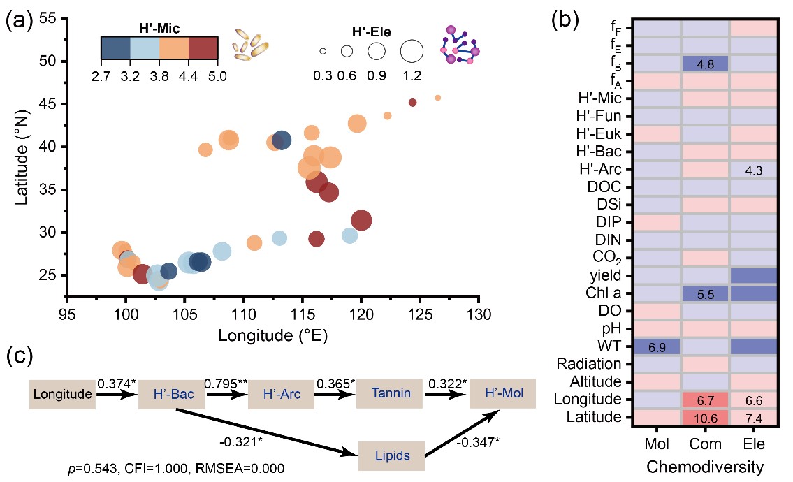 图1. (a)水体中浮游微生物群落多样性(H’-Mic)和DOM元素组合多样性(H’-Ele)的地理学分布;(b)DOM化学多样性的随机森林分析;(c)水体中DOM分子多样性(H’-Mol)的影响关系的结构模型分析
