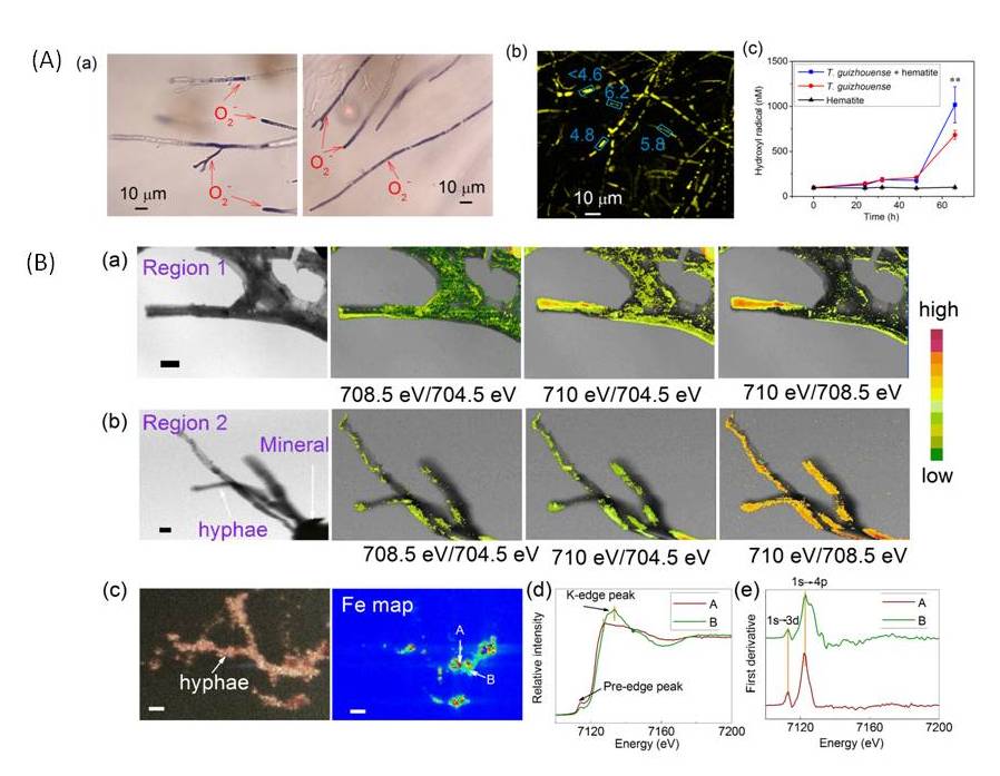 天津大学地科院界面过程与土壤圈演化研究中心余光辉教授与南京农业大学、中科院城市环境研究所、中国地质大学(北京)、图宾根大学、麦考瑞大学和俄勒冈大学的研究人员合作,综合应用同步辐射显微成像、高分辨透射电子显微镜等现代分析技术原位研究了真菌-矿物界面过程与机制。研究发现,木霉菌丝体的生长尖端和分化部位可以通过分泌超氧化物(O2-)启动类芬顿反应,生成高浓度(1000 nM)的羟基自由基,致使铁矿物溶解及纳米矿物(ferrihydrite)形成。铁是微生物必需的元素之一,微生物利用铁元素的已知2种途径为铁还原反应和释放铁载体;该发现表明微生物可以通过第3种途径获取铁元素,即分泌超氧化物(O2-)启动类芬顿反应。鉴于自然界中真菌普遍具有产超氧化物的能力,该研究结果对环境中养分循环、矿物碳封存及应对全球变化均具有重要的指导意义。