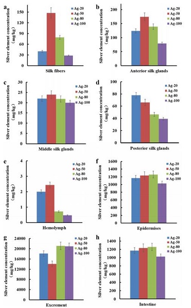 图3. 不同粒径纳米银在(a)蚕丝纤维和家蚕(b)前部丝腺,(c)中部丝腺,(d)后部丝腺,(e)血淋巴,(f)蚕皮,(g)蚕沙和(h)蚕肠中的平均含量。