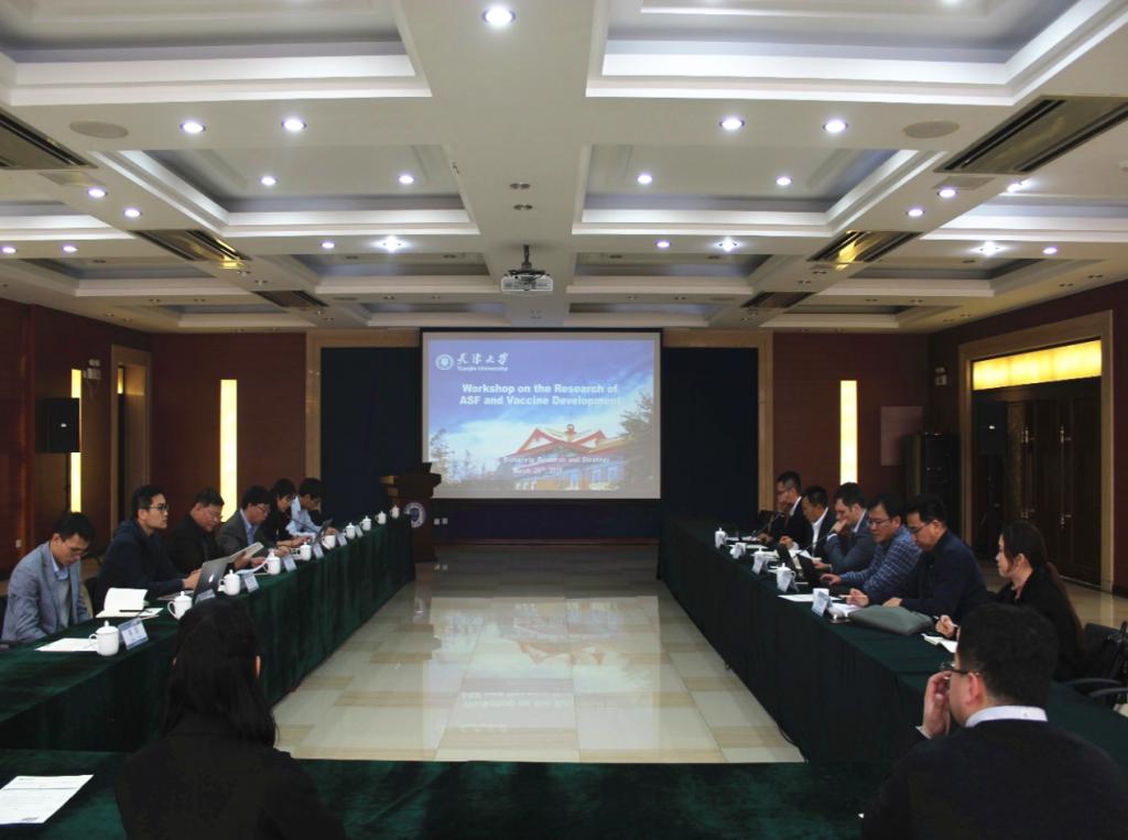 本站讯(通讯员 宋馨宇)2019年3月26日,“非洲猪瘟疫苗研制与全球防控研讨会”在天津大学卫津路校区召开。中国动物卫生与流行病学中心主任吴晓东研究员,PIC亚太区健康保障部总监姚健聪先生,PIC亚太区供应链总监Ghenadie Popa先生应邀出席。天津大学党委常委、副校长元英进,生物安全战略研究中心执行主任张卫文,生命科学学院黄金海教授,化工学院吴毅副教授,法学院薛杨副教授,生物安全战略研究中心的孙韬博士、焦鹏飞博士、宋馨宇博士等参加了研讨会。