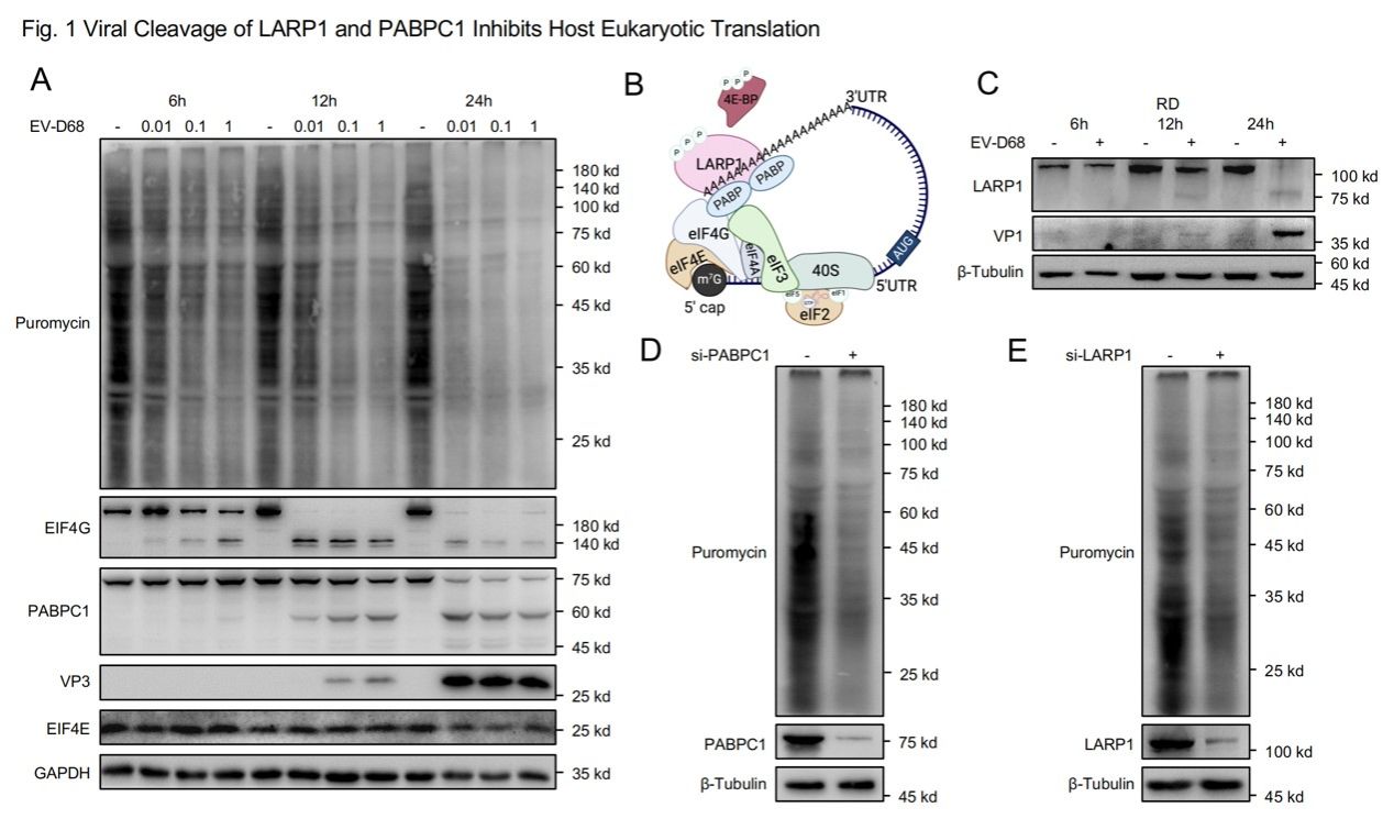 发表于《PLOS Pathogens》题为“EV-D68 cleaves LARP1 and PABPC1 by 3Cpro to redirect host mRNA translation machinery toward its genomic RNA”的论文中,王涛团队报导EV-D68感染显著抑制宿主整体蛋白翻译水平,LARP1和PABPC1分别被病毒蛋白酶3Cpro和2Apro切割,而EV-D68切割削弱其翻译调控功能,达到削弱宿主翻译的目的;病毒可利用IRES介导的不同于宿主的翻译机制,增强病毒自身的蛋白合成和病毒复制。