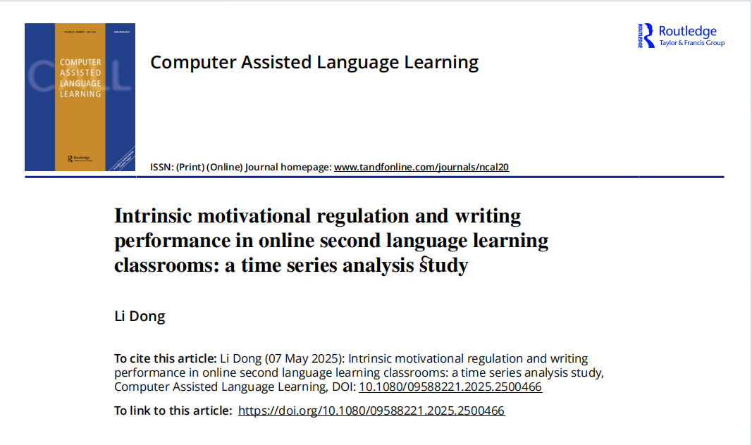本站讯(通讯员 霍培)近日,外国语学院董礼副教授在语言学国际顶级期刊《Computer Assisted Language Learning》发表题为 “Intrinsic motivational regulation and writing performance in online second language learning classrooms: a time series analysis study” 的研究论文。
