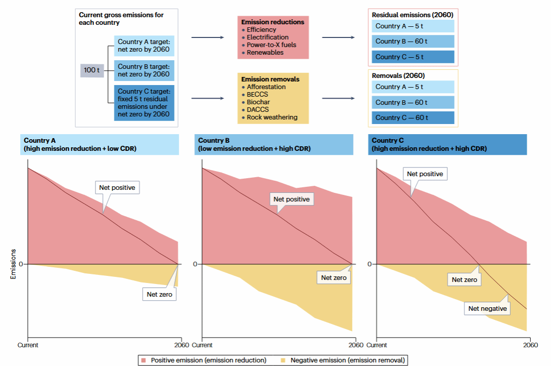 在第二个政策设计中,净零政策中纳入了固定的源头减碳目标(与CDR分开),此时并行部署的CDR作为补充,而非取代脱碳。根据这一设计,一个国家可以自由选择高或低CDR路径,只要部署的CDR足以实现净零目标即可。尽管国家A和国家C在2060年都达到了相同的剩余排放水平,但国家C通过积极的CDR部署,能够更早地实现净零排放并过渡到净负排放。因此,CDR既可以推迟减排速度,延长超调时间;也可以与快速脱碳相结合,作为加速实现净零和净负排放、缩短温度超调期的关键工具。