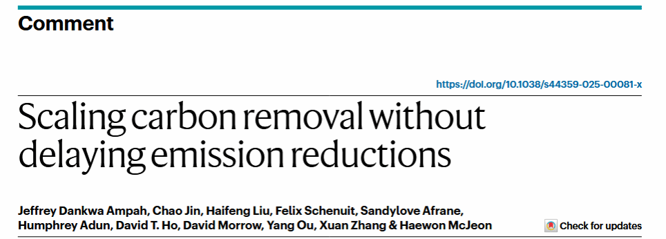 本站讯(文/刘海峰)碳移除(Carbon Dioxide Removal,简称为CDR)在未来帮助实现全球净零目标方面具有重要意义,但过度依赖CDR技术将导致高碳行业源头减碳动力不足,例如从化石燃料向可再生能源的过渡放缓。但是,如果不采用CDR技术,则根本无法实现《巴黎协定》所制定的1.5℃温升目标。近期,机械工程学院刘海峰教授、环境科学与工程学院金超教授带领的科研团队利用全球气候变化的综合评估模型(Global Change Analysis Model,简称为GCAM),探究了如何在追求二氧化碳减排的同时,推进CDR的部署。提出了“并行目标”的碳中和控制策略—明确界定源头减碳与CDR的贡献,独立设定源头减碳目标与CDR目标,该策略表明CDR可以与快速脱碳相结合,作为加速实现净零和净负排放、缩短温度超调期的关键工具,消除了外界对CDR的长期负面看法,以及关于其部署可能消耗更多化石燃料并延缓脱碳进程的担忧。该工作以题为“Scaling carbon removal without delaying emission reductions”的论文发表于国际期刊《自然综述:清洁技术》(Nature Reviews Clean Technology,论文链接:https://doi.org/10.1038/s44359-025-00081-x),机械工程学院博士研究生Jeffrey Dankwa Ampah为论文的第一作者,机械工程学院刘海峰教授和环境科学与工程学院金超教授为论文共同通讯作者。