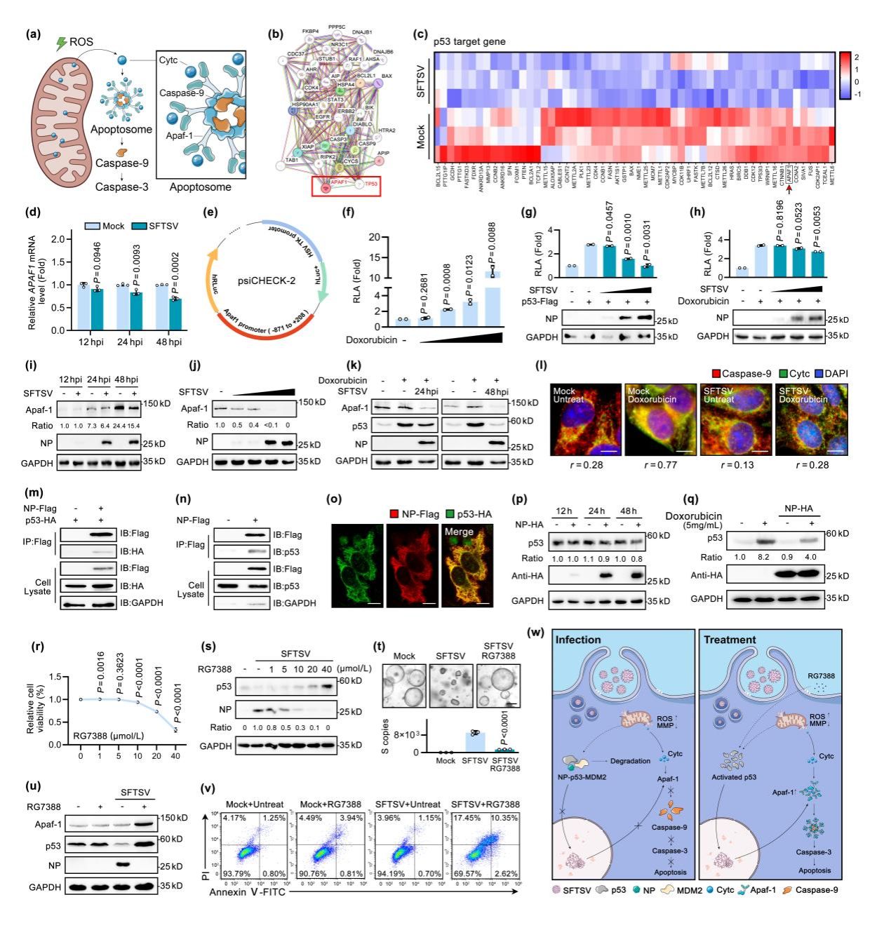 近日,来自天津大学医学部生命科学学院、天津大学合成生物技术全国重点实验室的王涛教授团队在《Science Bulletin》在线发表题为“RG7388 inhibits SFTSV replication by suppressing MDM2-mediated p53 degradation and preventing apoptosome disruption”的研究论文,该工作揭示了SFTSV感染诱发的线粒体损伤与细胞凋亡拮抗之间矛盾的分子机制,并依据研究成果发现抗癌药物RG7388具有良好的抗SFTSV效果。