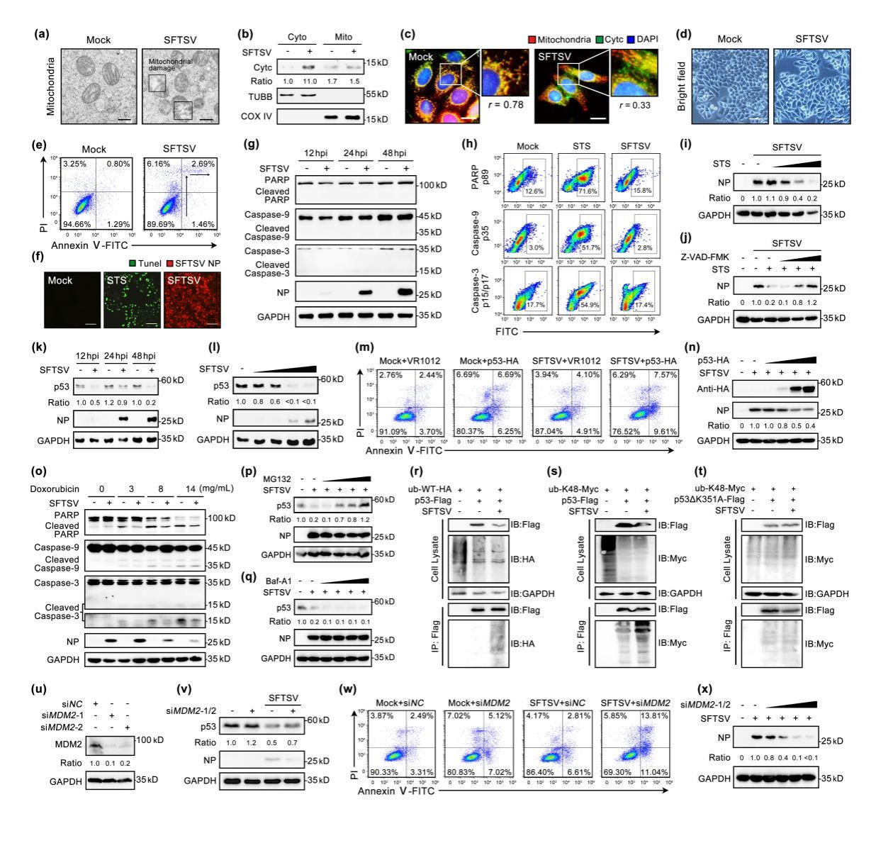 该研究首先全面表征了SFTSV诱导的线粒体损伤,并探讨了SFTSV与内源线粒体凋亡信号转导之间的关系。发现SFTSV可以促使Cytc转移至细胞质,但Caspase级联信号通路却未被激活。这表明SFTSV虽然触发了上游凋亡信号的启动,但并未导致凋亡过程的执行,提示SFTSV对凋亡信号具有调节作用。此外,团队还通过多组学整合分析的策略,发现SFTSV通过MDM2依赖的p53降解来抑制由线粒体氧化应激介导的凋亡发生。