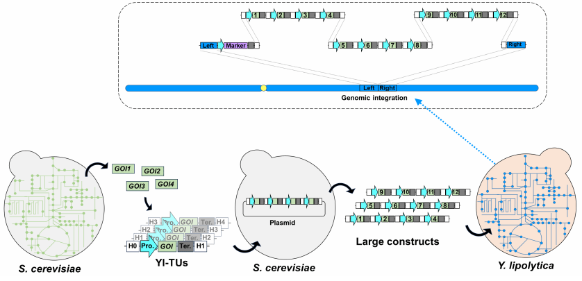 图1 脂耶氏酵母大规模基因组装与整合策略示意图