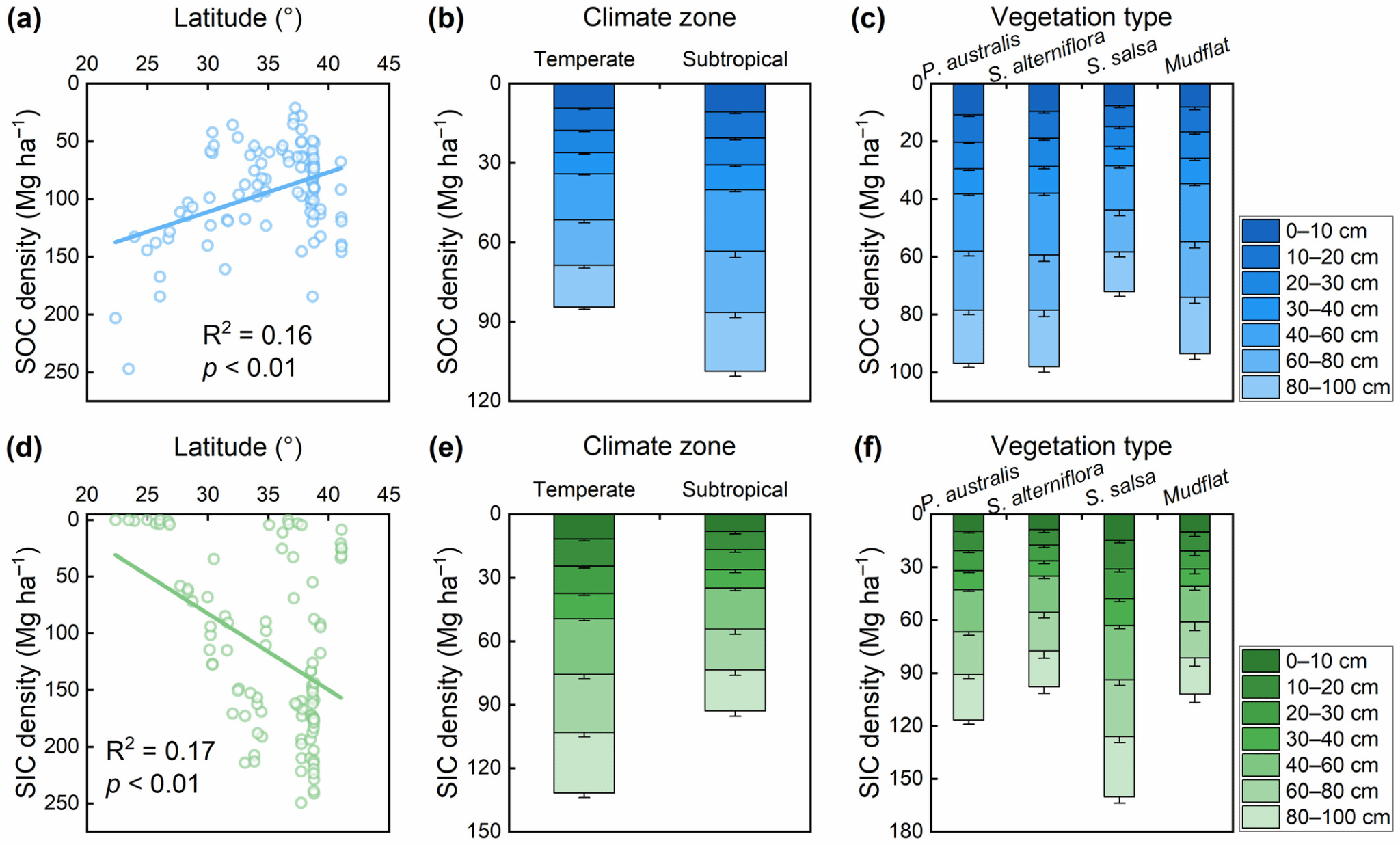 增加滨海湿地碳封存是应对全球气候变化的“基于自然的解决方案”的关键贡献者。作为我国滨海湿地的核心组成部分,滨海盐沼生态系统的蓝碳潜力尤为突出。然而,由于数据来源不同、样本量有限和方法不一致,蓝碳储量的估算仍存在较大的不确定性。此外,先前的研究重点是土壤有机碳(SOC),而对土壤无机碳(SIC)的关注很少,导致对滨海盐沼碳库的认知存在偏差。