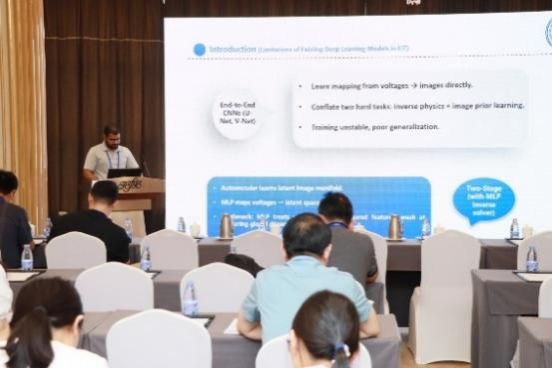 来自日本千叶大学的武居昌宏教授作了题为“Electrical Impedance Tomography for Biomedical Application”的报告。武居昌宏教授是国际知名的生物医学成像专家,曾任ISIPT主席,千叶大学副校长。电阻抗层析成像(EIT)是一种新兴的无创成像方法,具有低成本、便携、无辐射等优势。武居昌宏教授详细介绍了EIT在淋巴水肿监测、肌肉活动成像和胃部功能成像等方面的应用案例,强调了其在实时监测与动态过程观察中的独特优势,展示了其在医学诊断与康复治疗中的巨大潜力。