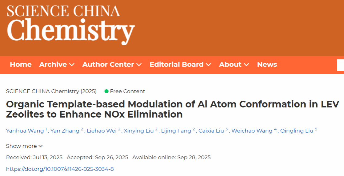 时值天津大学建校130周年,环境科学与工程学院刘庆岭教授团队在氮氧化物(NOx)净化技术领域取得重要科研成果。研究团队创新性地提出基于有机模板剂调控LEV型分子筛铝原子空间构象的新范式,成功攻克传统催化剂低温活性不足及水热稳定性差的技术瓶颈。研究成果以《Organic Template-based Modulation of Al Atom Conformation in LEV Zeolites to Enhance NOx Elimination》为题发表于国产顶级期刊《中国科学:化学》(Science China Chemistry)。该论文由博士生王延华、张岩担任共同第一作者,刘庆岭教授为通讯作者。