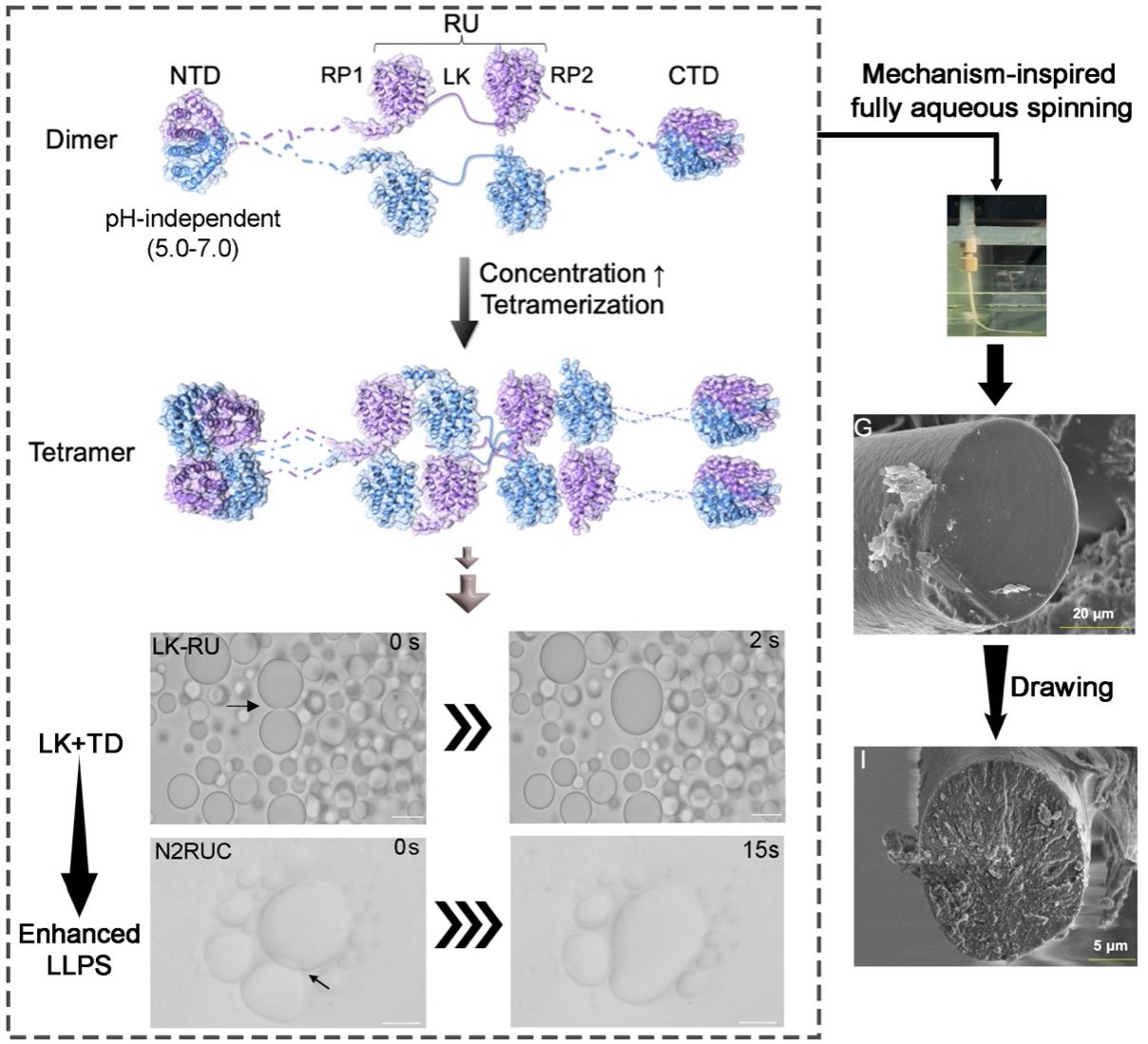 该研究首先重新定义了来自黑寡妇蜘蛛的AcSp1重复区:它由16个重复单元(RU)构成,每个RU包含两个序列相似度约 45%的重复结构域(RP1 与 RP2);二者结构高度相似,并通过长度为42–46个残基的连接肽(LK)相连,该连接肽为包裹丝蛋白的固有无序区。LK主要通过疏水互作并辅以静电作用驱动丝蛋白重复单元发生液液相分离。接着研究发现,AcSp1的N末端结构域(NTD)在生理性 pH 范围(5.0–7.0)内可稳定形成二聚体,并在更高浓度下进一步四聚化,呈现出一种主要依赖浓度而非pH的分级组装机制,这与其它丝蛋白,比如壶腹腺丝蛋白依赖pH的成丝机制明显不同。结构分析显示,该同源二聚体表面交替分布正负电荷区,为四聚化提供了静电互作的基础。进一步研究发现,两个末端结构域的同时存在(NRUC或N2RUC),能显著促进丝蛋白相分离,特别是在一定盐离子存在下。因此,作者提出由固有无序区和末端结构域协同通过LLPS驱动包裹丝蛋白自组装的模型。这种由蛋白无序和有序结构共同促进的相分离机制,可在高密度储存与快速构象转变这两种需求之间实现平衡。
