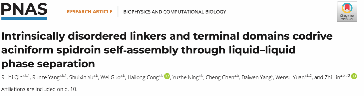 2025年10月8日,天津大学医学部生命科学学院林志教授团队在PNAS上发表了题为Intrinsically disordered linkers and terminal domains codrive aciniform spidroin self-assembly through liquid–liquid phase separation的研究论文。这项研究结合液-液相分离(LLPS)和材料学技术,对包裹丝蛋白 AcSp1 的结构特征及其自组装机制进行了系统性研究,为设计和制造兼具韧性与弹性的丝基生物材料提供了新的理论基础。