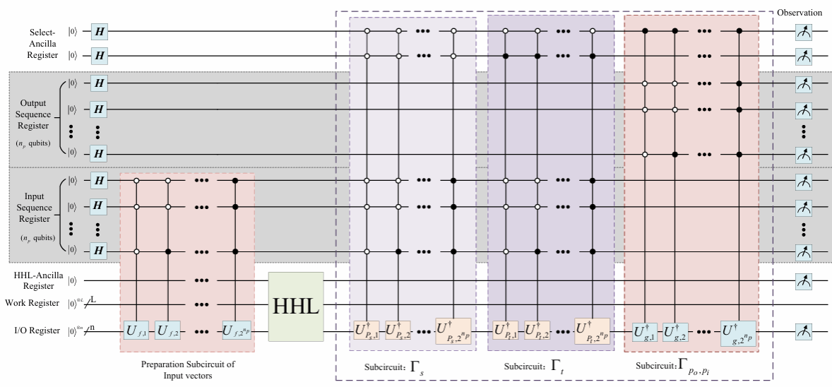 在上述研究成果的基础上,进一步提出多端口 S 参数同步求解方法,相关研究论文已被微波领域顶级期刊《IEEE Transactions on Microwave Theory and Techniques》(TMTT,中科院一区 TOP 期刊)录用,课题组博士生李小龙为论文第一作者。传统电磁仿真在计算多端口S参数时,需同步获取电场幅值与相位信息;然而,HHL等现有量子算法虽能高效求解线性系统,却无法直接输出相位,这一局限导致了无法求解出实际电路所必须使用的S参数这一难题。针对这一难题,该文章从经典的S参数定义切入,构建了一套全新的适配量子计算HHL框架的数学表达形式。在此基础上,研究进一步从理论层面延伸至应用层面,创新性提出量子内积测量与HHL的融合框架,通过构造多个量子内积操作,结合无源系统特性,实现了对多端口S参数幅值的直接量子计算。同时设计了集成化量子电路,可在单次运行中同步计算所有S参数幅值,显著提升了计算效率。