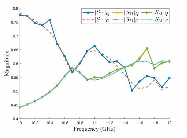 图1 量子计算电磁结果与经典计算电磁的S参数结果对比