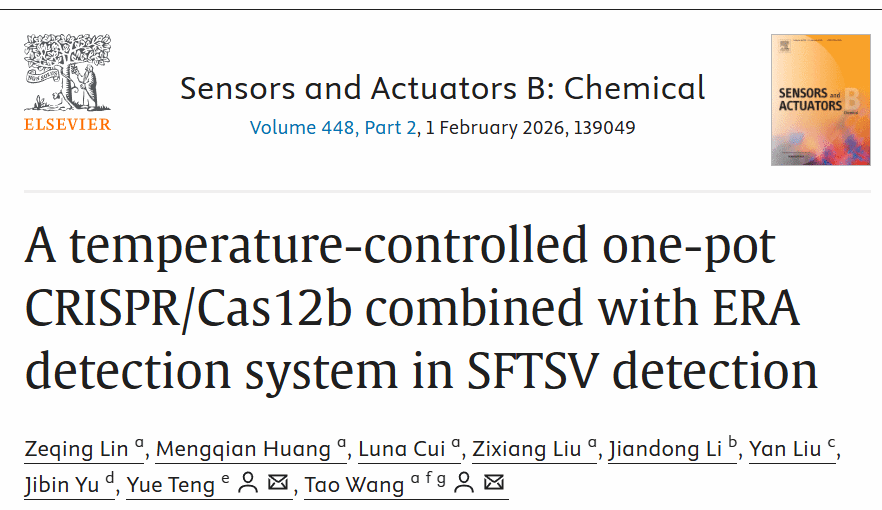 近日,天津大学医学部生命科学学院、天津大学合成生物技术国家重点实验室的王涛教授团队在国际期刊《Sensors and Actuators: B. Chemical》(中科院一区Top期刊)在线发表题为 “A temperature-controlled one-pot CRISPR/Cas12b combined with ERA detection system in SFTSV detection” 的研究论文,报道了一种基于温度控制的CRISPR一锅法检测新体系(Temperature-Controlled One-pot Detection,简称 TCOD),为SFTSV的快速诊断提供了高灵敏度、低成本的新方案。