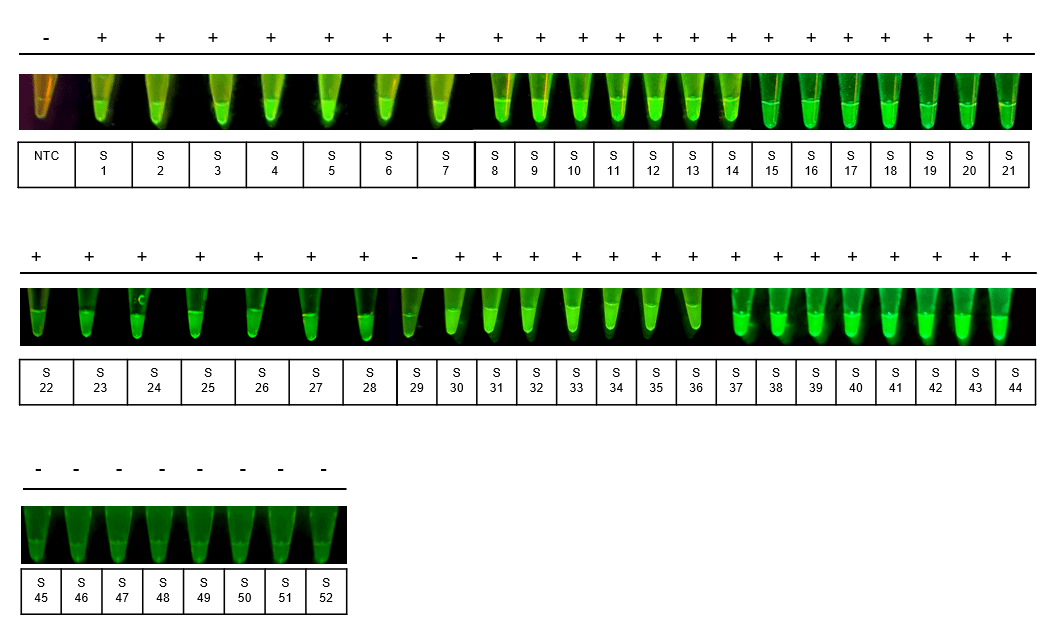 研究人员利用52份临床血清样本对该体系进行了验证,TCOD与实时荧光定量PCR(qPCR)结果的符合率达100%,充分证明了其准确性和可靠性。同时,TCOD体系的检测结果可在蓝光照射下直接通过肉眼观察区分阳性与阴性样本,展现出优异的现场可操作性和直观可视化特征,适合用于基层及应急检测场景。
