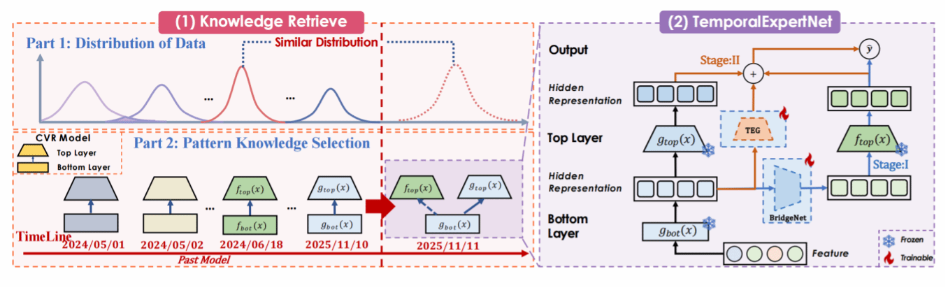 论文提出 TEN(TemporalExpertNet)跨时间知识复用框架,面向促销期用户与广告主行为突变导致的 CVR 漂移(CVR drift) 难题,首次将“知识迁移”引入促销期 CVR 预测的系统性解决方案:通过把历史模型沉淀的有效知识与促销期间的新行为模式进行结构化衔接,实现促销场景下更稳健、更准确的预测能力。其核心思路包括: