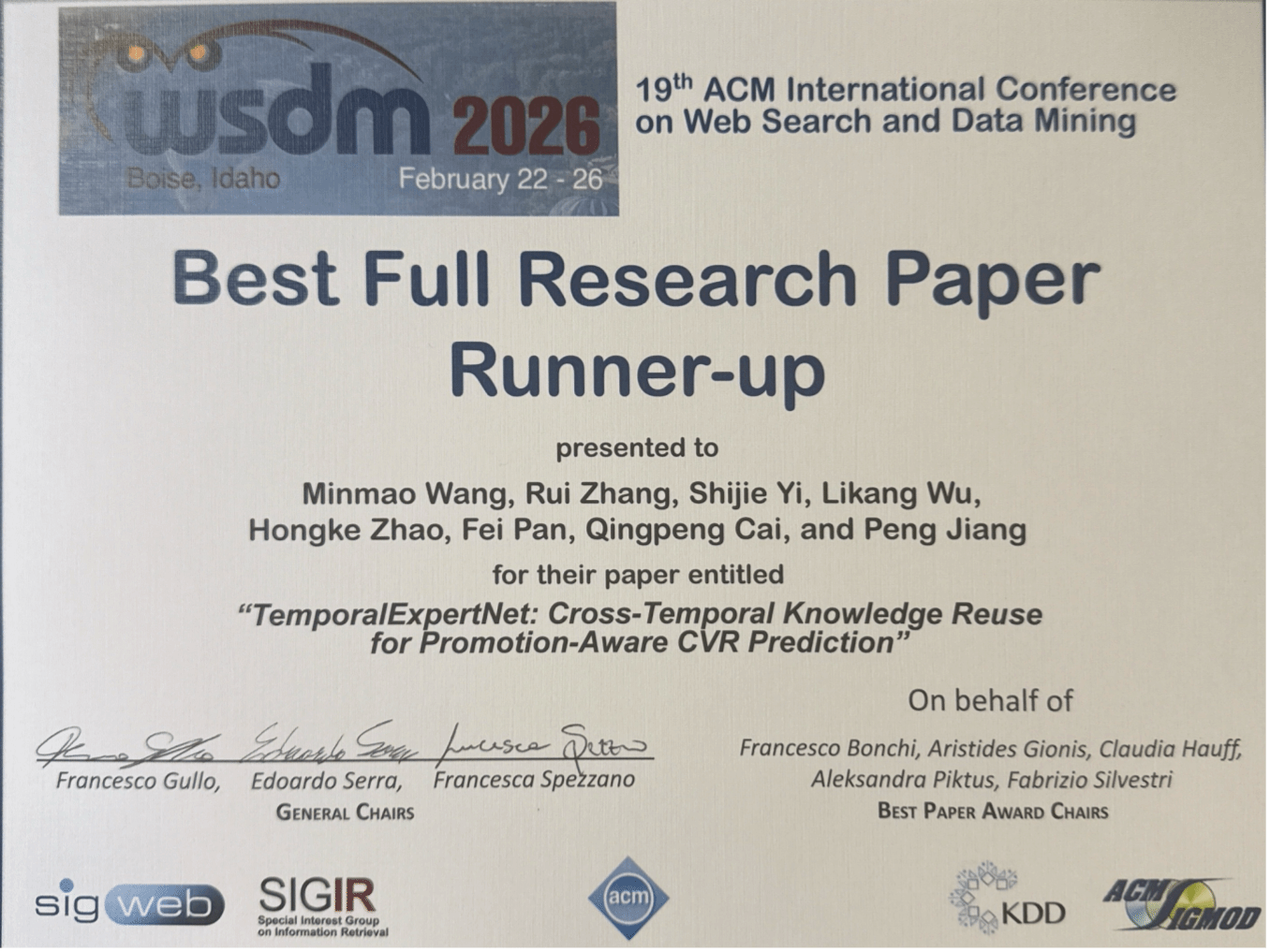 本站讯 近日,国际数据挖掘顶级学术会议 WSDM 2026(ACM International Conference on Web Search and Data Mining) 在美国爱达荷州博伊西(Boise, Idaho, USA)举行。在信管系吴李康老师与赵洪科老师指导下,管理与经济学部优秀毕业王慜懋在读期间完成的研究论文 《TemporalExpertNet: Cross-Temporal Knowledge Reuse for Promotion-Aware CVR Prediction》 荣获大会 Best Paper Runner-Up(最佳论文提名奖)。本届 WSDM 大会评审流程严格,主会议共收到全球投稿 613 篇,最终录用 100 篇,录用率为 16.3%,仅评选出 1 篇最佳论文(Best Paper)与 1 篇最佳论文提名奖(Best Paper Runner-Up)。