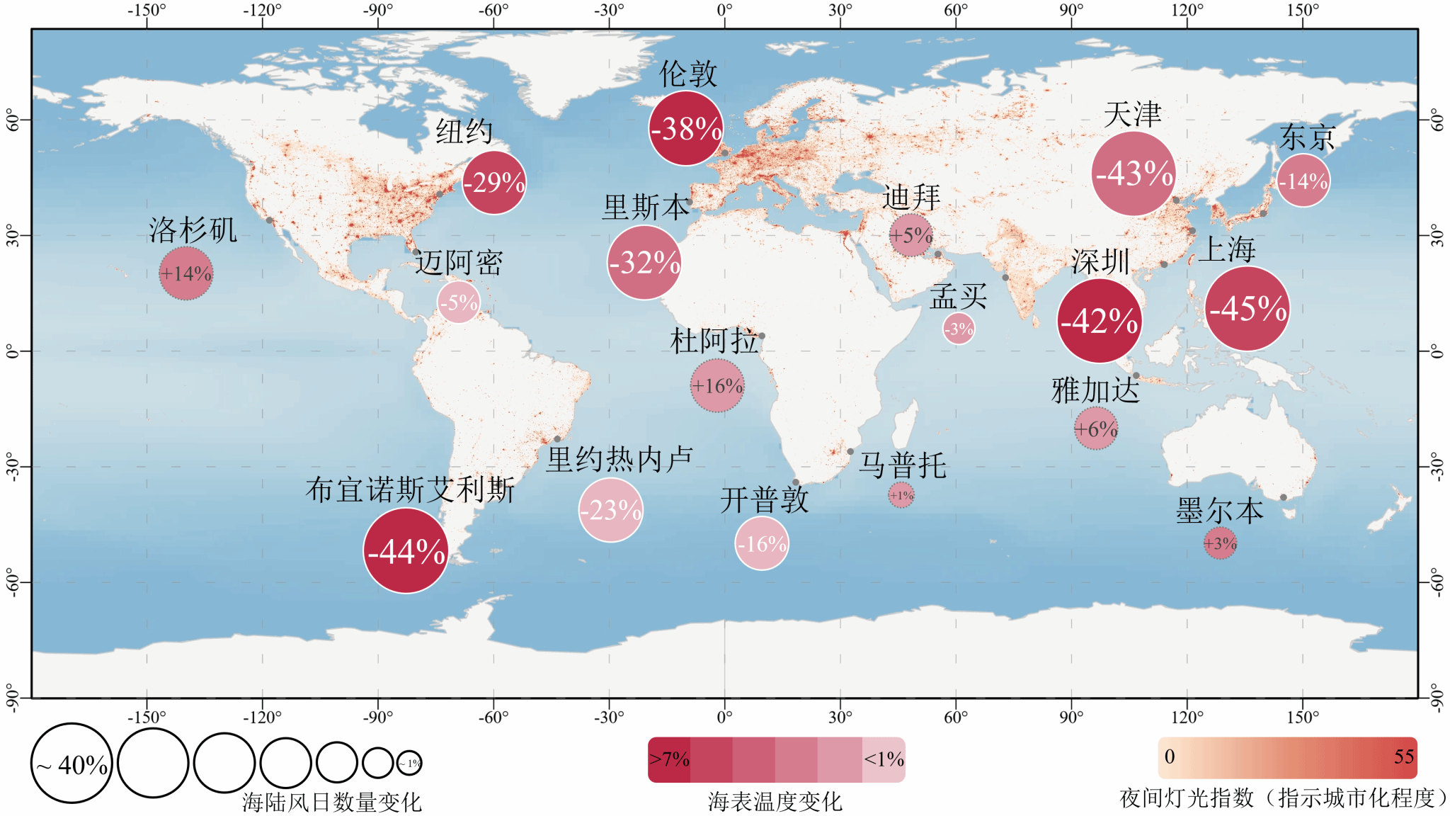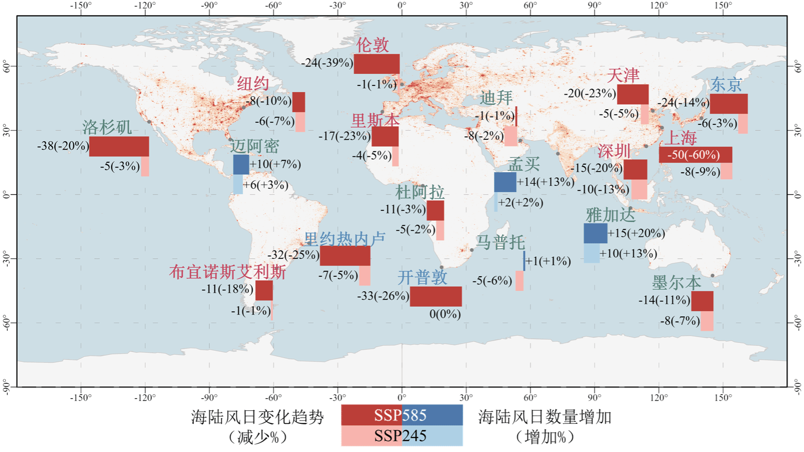 研究发现,在过去的40年间,海温升高导致2/3的典型滨海城市海陆风日数量减少、降幅达3-45%。其中,中纬度滨海城市(如纽约、伦敦、上海、里斯本等)海陆风日数对海温升高最敏感。这些城市区域海洋升温幅度均大于5%,远大于陆地升温幅度,导致海陆温差缩小,抑制了触发海陆风环流的关键热力因素。这一减弱效应在夏秋两季尤为突出。高升温情景(SSP5-8.5)下平均海表温度仅比低升温情景(SSP2-4.5)高约0.4℃,但高影响区城市的海陆风日数降幅却是低升温情景的4.5倍(平均降幅从6%增至27%)。这意味着海陆风对海温升高呈现高度非线性响应,微小增温即可引发剧烈衰减。研究首次系统揭示了海洋变暖通过削弱局地热力环流、隐性威胁滨海城市天然通风降温能力的机制,将全球气候信号与滨海宜居风险直接关联,为评估和预测滨海城市脆弱性提供了全新科学视角。