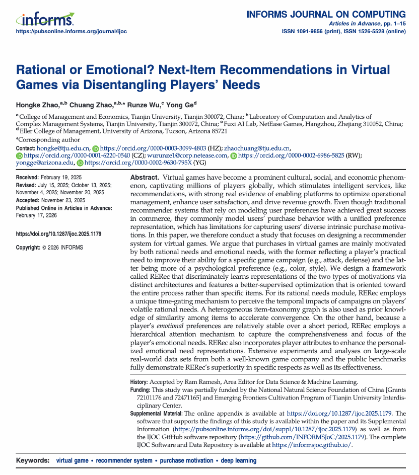 该研究由天津大学管理与经济学部赵洪科副教授、赵闯博士,网易伏羲人工智能实验室吴润泽研究员,以及美国亚利桑那大学Yong Ge教授联合完成,聚焦虚拟游戏场景下的智能推荐这一前沿议题。在方法上,团队首次基于消费动机理论,将玩家购买行为解构为理性需求与情感需求双维度,创新设计了差异化建模框架 RERec,实现了从传统统一偏好建模向精细化动机感知的关键突破,系统揭示了游戏场景中玩家需求的异质性特征与动态演化规律。该成果不仅为虚拟游戏推荐系统提供了全新的理论视角与技术方案,也标志着在数字娱乐与人工智能交叉领域的重要学术进展。