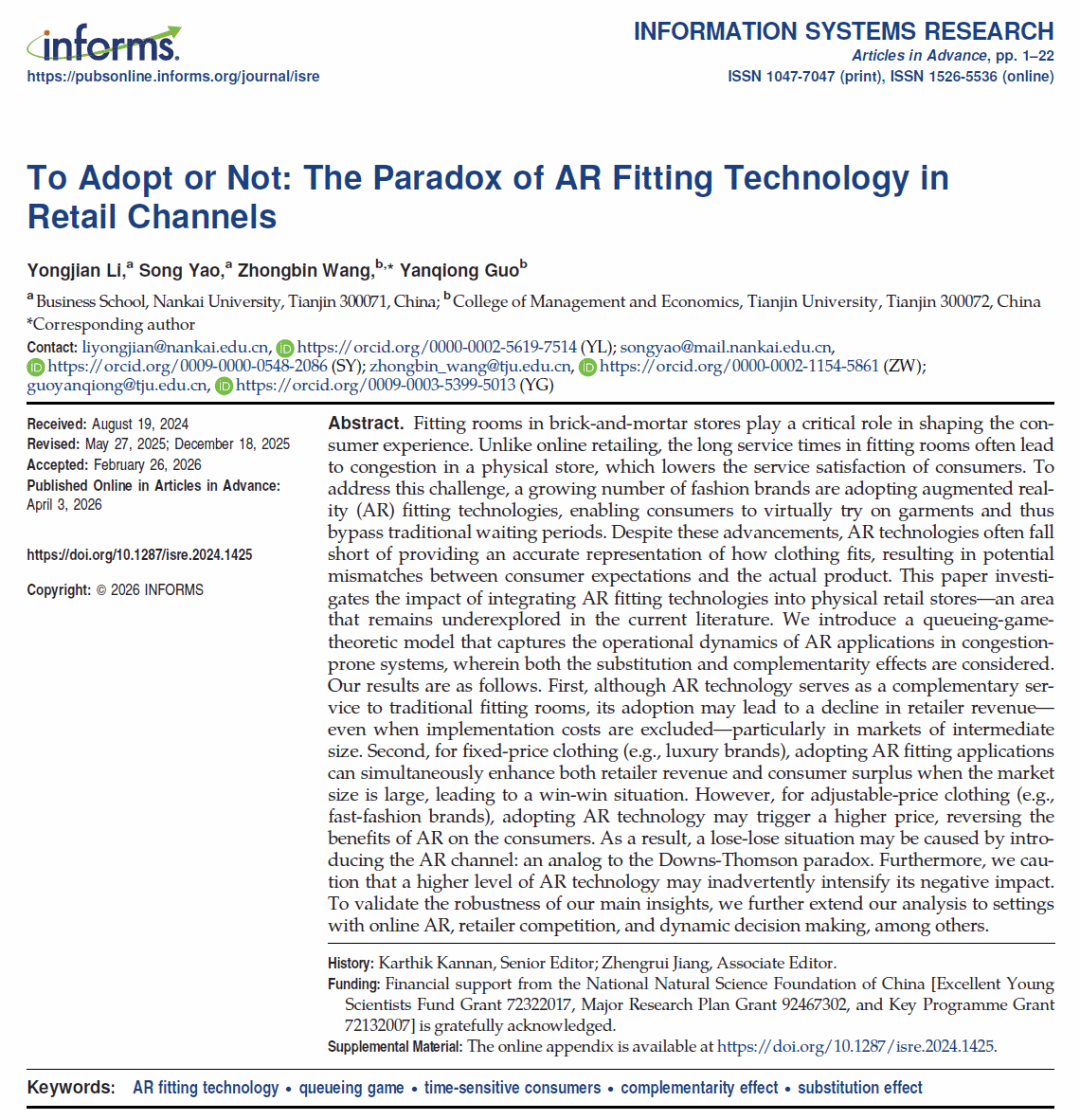 近日,经管学部系统工程研究所王钟彬教授作为通讯作者的论文《To Adopt or Not: The Paradox of AR Fitting Technology in Retail Channels》在信息系统领域的国际顶级期刊Information Systems Research在线发表。