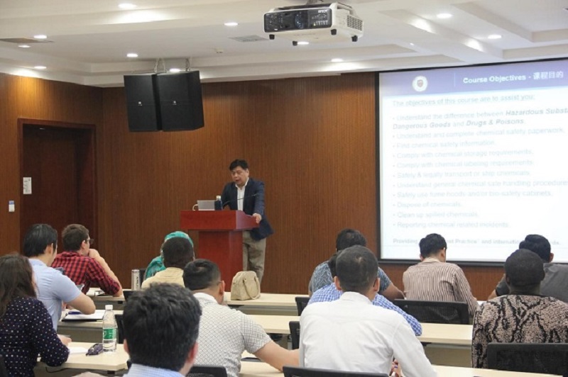卫宏远教授结合自身多年在实验室安全管理方面丰富的经验,从化工实验室基本安全知识、实验室安全防火应掌握的基本常识以及实验室安全指南要点等展开,通过分析化工类安全事故等警示案例,为留学生详细介绍实验室安全事故发生的危险性及在发生危险时的自救方法,并要求留学生在实验操作过程中应时刻注意防范安全隐患。