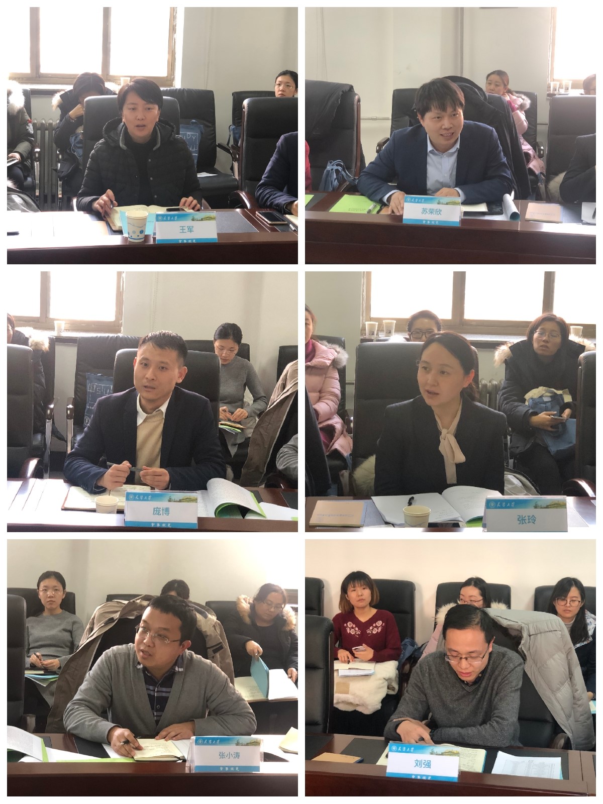 【化工学院副院长王军、海洋科学与技术学院副院长苏荣欣、医学工程与转化医学研究院副院长庞博、药物科学与技术学院副院长张玲、分子聚态科学研究院副院长张小涛、微电子学院副院长刘强在会上发言】