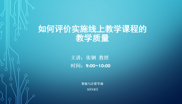 学部邀请学校在线教学质量专家组组长、智能与计算学部教授张钢老师进行了题为《如何评价实施线上教学课程的教学质量》的报告。首先,报告对课程教学质量评价的理念进行了讲解,指出线上课程教学质量需要质量管理体系的保障,既要关注目标达成度,又要在教学过程中作好形成性评价。其次,分享了学校在线教学质量保障专家组的工作思路,指出专家组将从制定在线课程质量标准、评价方法和开展在线课程质量督导等方面开展多维度、全过程的督导和评价,全面跟进在线教学工作动态,为在线教学质量提供保障。最后,介绍了开展线上教学情况调研的主要内容,从教师自查的主要内容及试图发现的问题、督导专家听课的主要内容及试图发现的问题以及教学平台记录的教学数据分析三个方面做出详细解析。报告后的问答环节中,教师们积极发言,针对开学以来线上教学过程中遇到的问题和心得体会进行了深入交流。