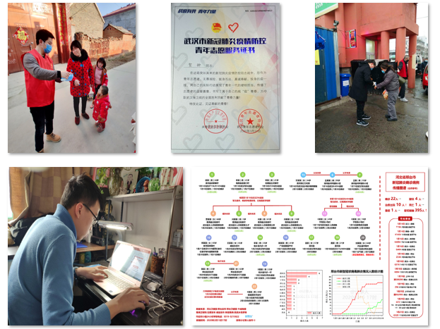 张越鲲说:“我主要负责在课余时间和周末负责社区进出入检查,为居民进行体温检测的工作。比起宅在家里,能够为自己身边的人提供力所能及的帮助,是我们青年人在这个特殊时期应该做的,能够看到邻居们陆陆续续的安全归来也是一种快乐。”在这个特殊的寒假里,学院许多学生党员通过向社区报道、为抗疫医务人员子女辅导功课等方式收获了十分珍贵的体验,为抗击疫情贡献了自己的一份力量。2018级博士生贺翀在武汉抗疫一线担任志愿者,在永旺金桥店接力完成了分拣、打包、装卸、配送生活保障物资等一条龙服务,在十余天内为周边居民送去了“武汉加油蔬菜包”近万份和“京东到家”个性订单数千份。2019级硕士生许全军从1月26日开始在河南省周口市商水县固墙镇三合村担任志愿者,在防疫一线协助基层干部做好防控工作。他承担防疫理论宣讲工作,发放防疫手册,宣传抗疫知识,在值班点发放体温计、口罩和消毒液等物资,并入户排查登记返乡流动人口。2016级本科生白易明自1月底起开始在本地率先整理更新邢台市疫情传播图谱,在微博等渠道已发布20张图谱,累计阅读量超10万次,获点赞百余次,相关工作也得到了邢台市人民政府官方微信及本地媒体邢台日报、牛城晚报的报道。2018级硕士生毕极主动担任高三学子的辅导老师,不仅通过视频辅导、共享屏幕等方式为学子解答学业疑惑,还针对受疫情期间学生出现的心理问题及时进行心理疏导。