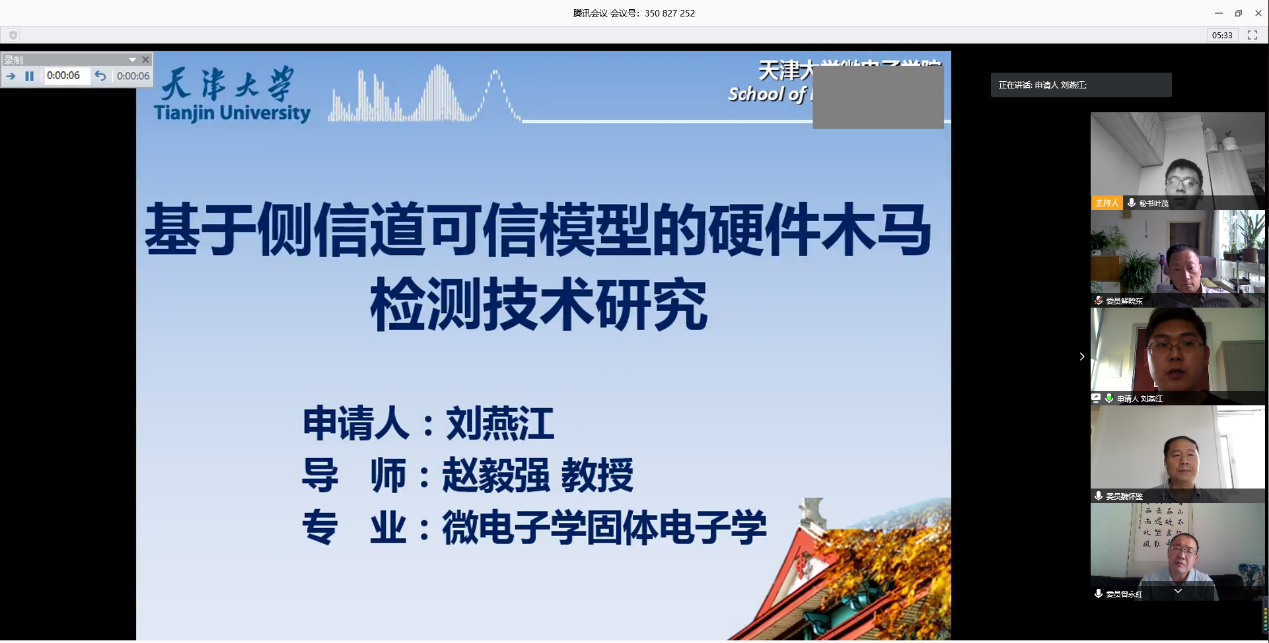 本站讯(通讯员 赵雪)5月24日,天津大学微电子学院博士生刘燕江利用腾讯会议平台完成了本学院首次博士学位论文线上答辩。