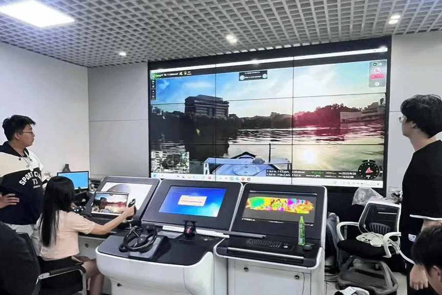 25日下午,课程进入高阶实践阶段——无人船远程驾驶。海洋学院搭建的无人船远程驾驶系统,实现了操作端与船舶之间“数传+遥测+图像”三路信号的稳定互通。同学们在实验室内,即可远程操控位于青年湖的无人船,并实时接收视频画面与船位信息。