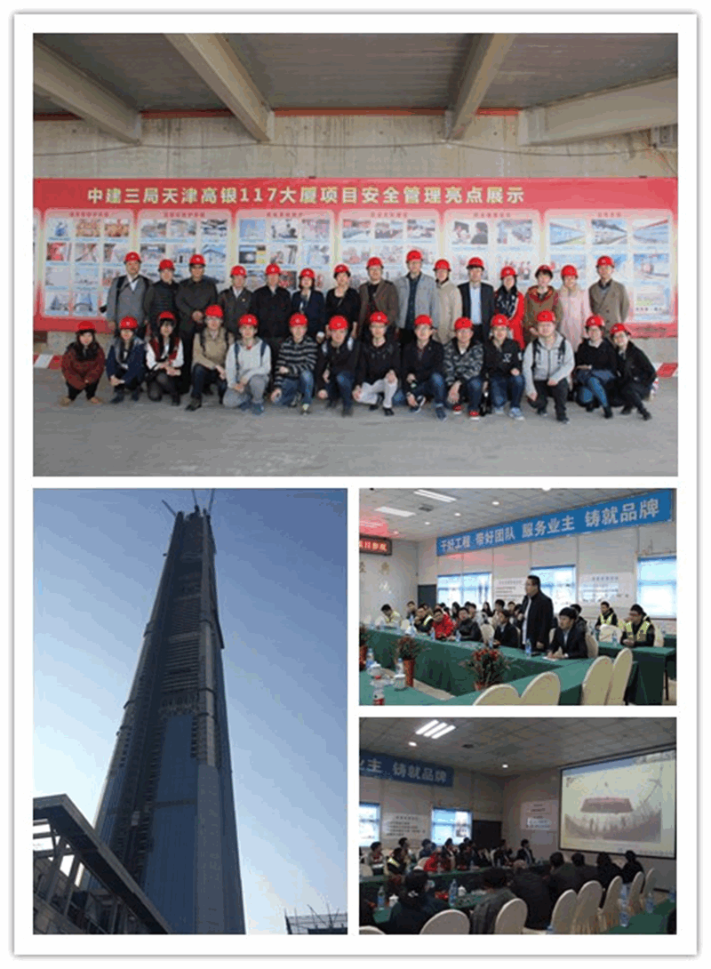 代表团一行首先来到117高银大厦项目现场,受到中建三局总承包天津分公司总工程师赖国梁、117大厦土建项目经理张凤超和117大厦总包部项目总工程师叶建的热情接待。在参观项目沙盘和观看项目视频资料后,代表团前往施工现场参观了117大厦主塔楼,在主塔楼84层转乘层就核心筒钢板剪力墙、巨型柱、压型钢板组合楼板等施工部位技术关键进行了现场交流讨论,项目技术负责人就水平位移监测、沉降监测、自密实混凝土施工等专业问题进行了详细介绍。
